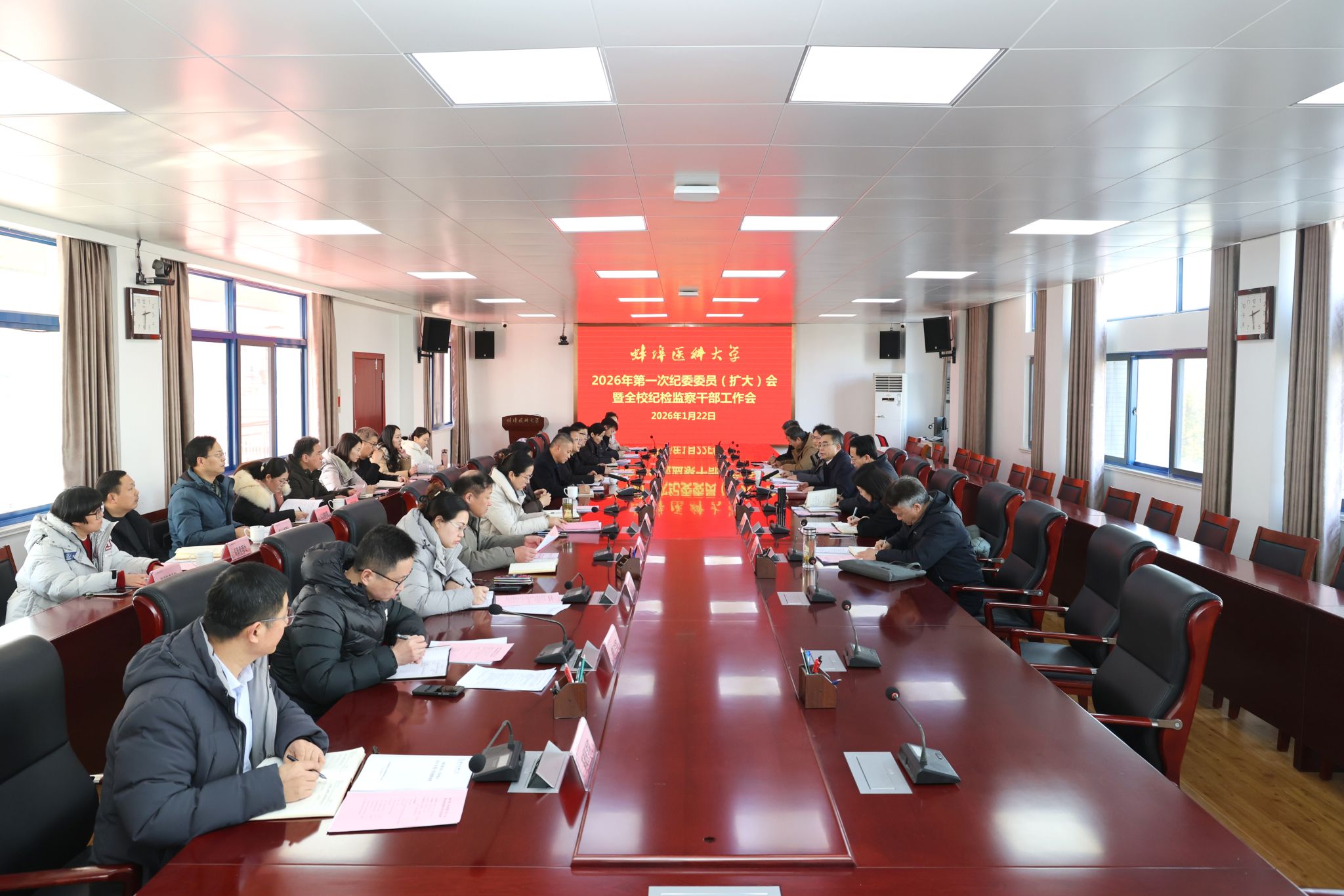 1月22日,学校召开2026年度第一次全体纪委委员(扩大)会议暨全校纪检监察干部工作会议。会议集体学习了二十届中央纪委五次全会精神,总结回顾了学校纪委2025年度主要工作情况,开展了二级纪委书记(纪检委员)述职评议工作。校党委书记朱立军主持会议并讲话,全体纪委委员、二级纪委书记、二级党组织纪检委员、专职纪检监察干部参加会议。